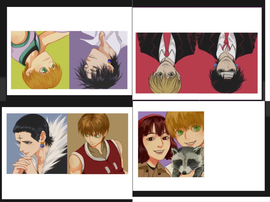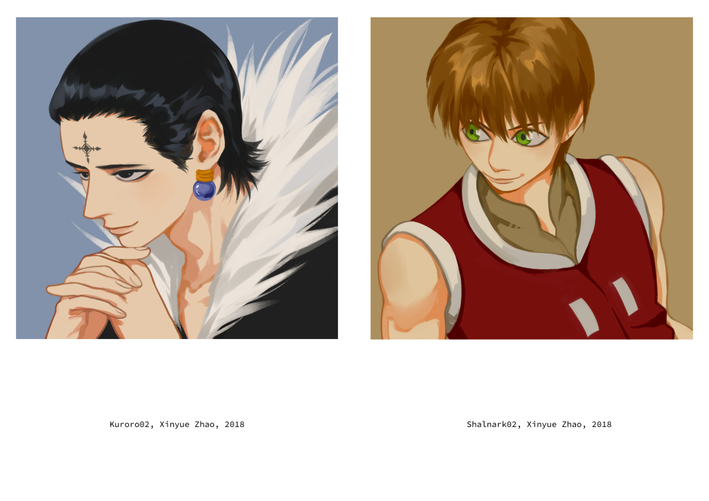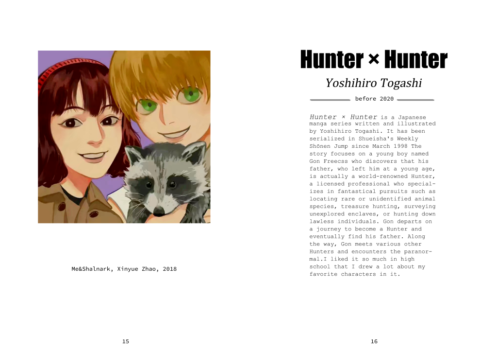 I’m a fan of Japanese manga since very young age. This is my drawing 3 years ago which shows my selfprotrait with my favorit character Shalnark in the manga Hunter x Hunter and 2 drawings about the characters in this manga. I used Indesign to make these designs and plan to use it in my book.