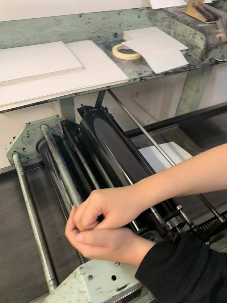 I find the machine of letter press very interesting and it is quite easy for me to use although i am a novice.I used it to print some words that I want to use in my project so that it will be more facile for me to create the shape of my words in my poster.