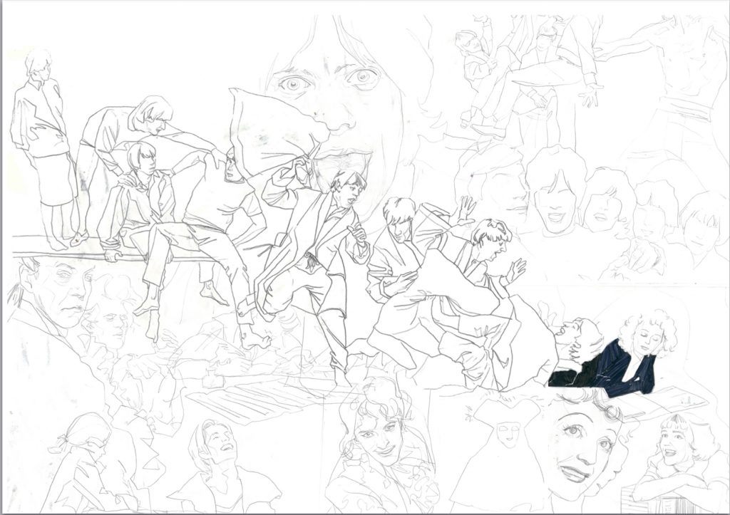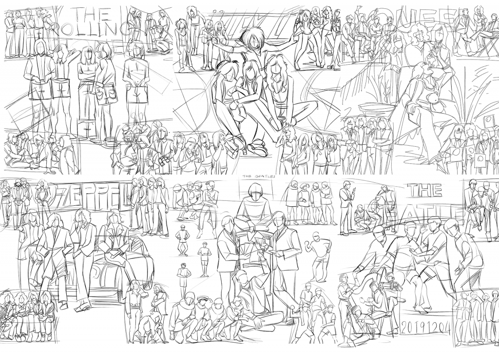 i find that all of the vinyls have their own unique and and representative covers, which reflects the process behind the product, the band’s living situations, their attitudes and their throughout. They are so representative that you can recognize them without seeing a face of any member of a band and even without read the title on it. I’m interested in how can they grasp the chatacter of the bands and their music so i want to try to drawing the people without their face and see if i still recognize them or not. Luckily, it was successful.