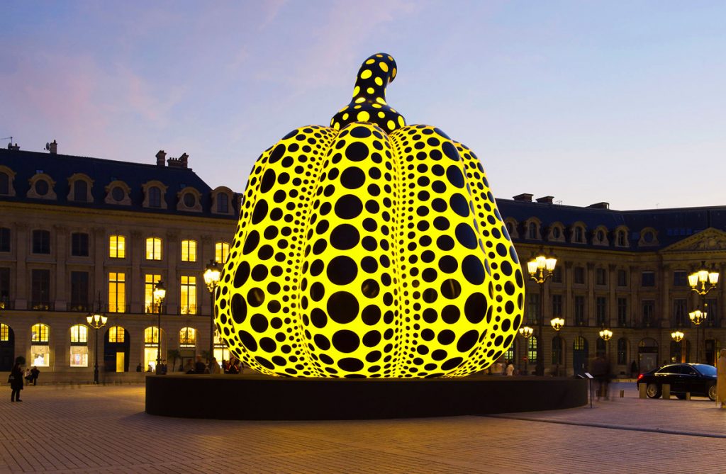 In the upscale Place Vendôme, Yayoi Kusama, who is known for her painting,sculpture,installation art ,performance art,film,fiction,fashion and writing and had a surge in popularity over the past decade, made a giant marquee outdoor installation, a inflatable pumpkin, in her signature polka dots. The installation is partly a collaboration with her galleries — Victoria Miro, David Zwirner and Ota Fine Arts.